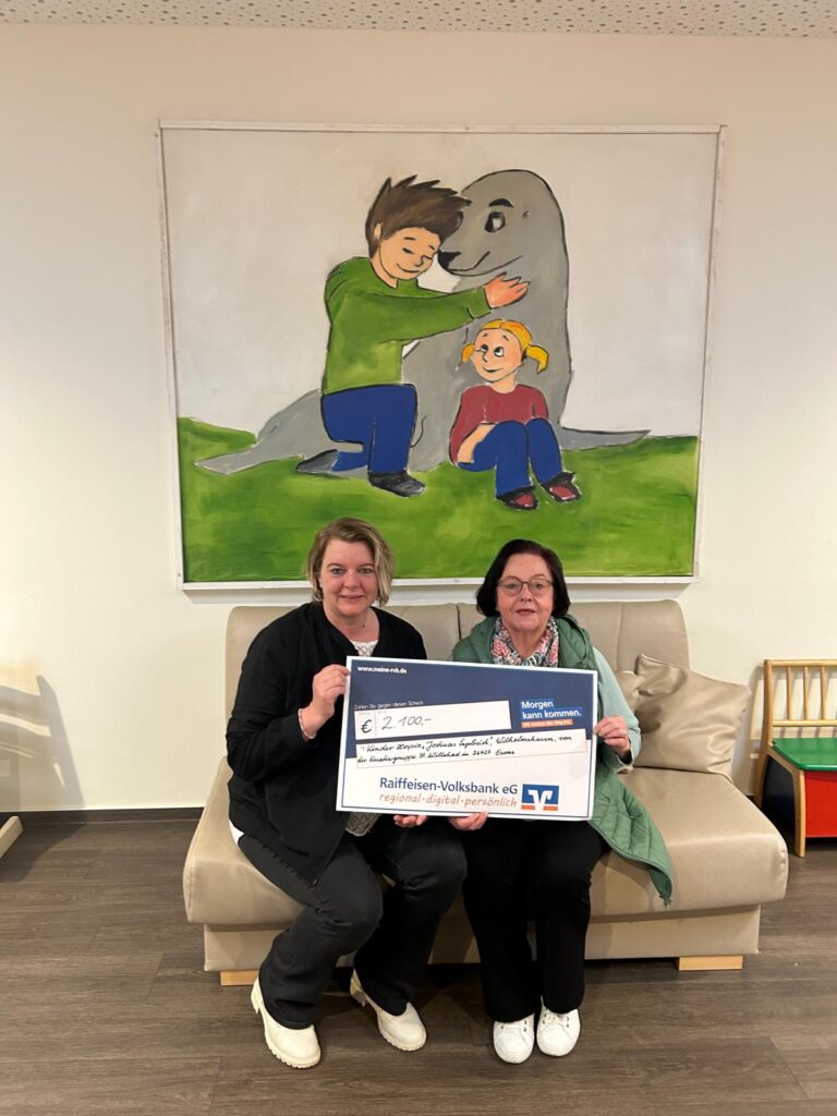 Am Freitag, dem 20. März 2026, wurde der Erlös des letztjährigen Adventsbasars von 2100 € durch Elke Jakobi vom Kreativkreis unserer Gemeinde mit einer symbolischen Schecküberreichung an das Kinder- und Jugendhospiz „Joshuas Engelreich“ in Wilhelmshaven übergeben. Das Bild zeigt Elke Jakobi (rechts) und die Leiterin des Hospizes Sandra Ecke (links).