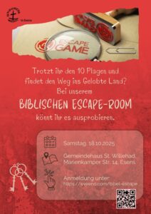 Biblischer Escape-RoomBirgit Wölk18. Oktober 2025Kinder Wann Sa., 18.10.2025 10:00 - 17:00 Zum Kalender hinzufügen ICS herunterladen Google Kalender iCalendar Office 365 Outlook Live Wo Gemeindehaus St. Willehad MArienkamper Str. 14, Esens Veranstaltungstyp Kinder