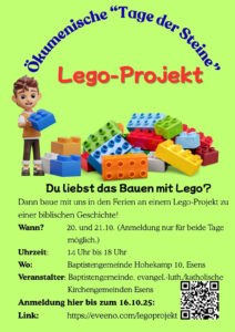 Ökumeische „Tage der Steine“ Lego-ProjektBirgit Wölk21. Oktober 2025Kinder Wann Di., 21.10.2025 14:00 - 18:00 Zum Kalender hinzufügen ICS herunterladen Google Kalender iCalendar Office 365 Outlook Live Wo Baptistengemeinde Hohekamp 10, 26427 Esens , Deutschland, 26427 Veranstaltungstyp Kinder